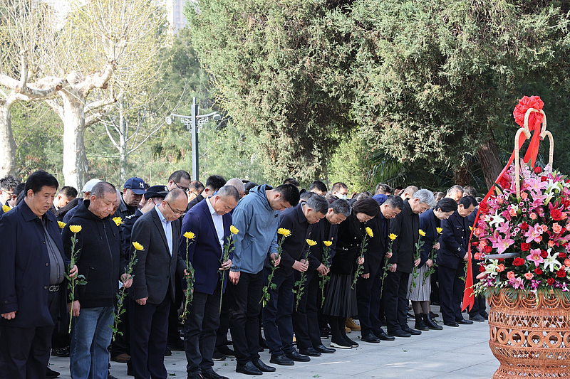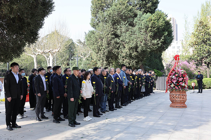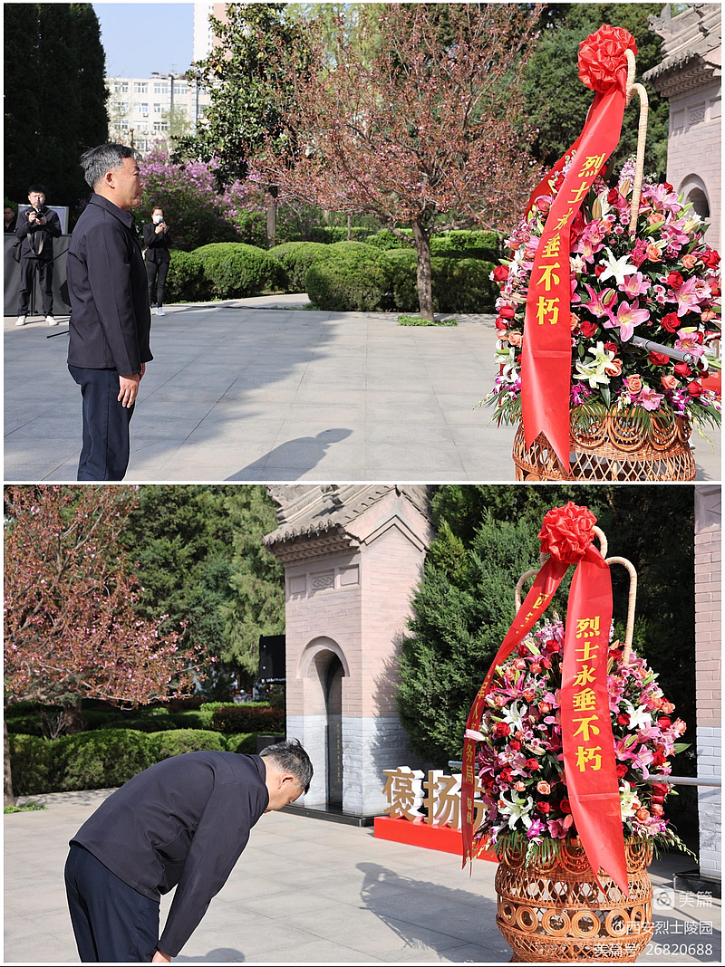 3月28日上午9:30,“2023•崇尚•清明祭英烈”追思活动在西安烈士陵园烈士墓前广场正式开始。奏唱《中华人民共和国国歌》,全体人员向为中国人民解放事业和共和国建设事业英勇献身的烈士默哀,向烈士敬献花篮,表达怀念与哀思,西安市退役军人事务局副局长闫亚林同志整理缎带并行三鞠躬礼。大家怀着无比崇高的敬意向烈士献花,并前往烈士墓区擦拭烈士墓碑。