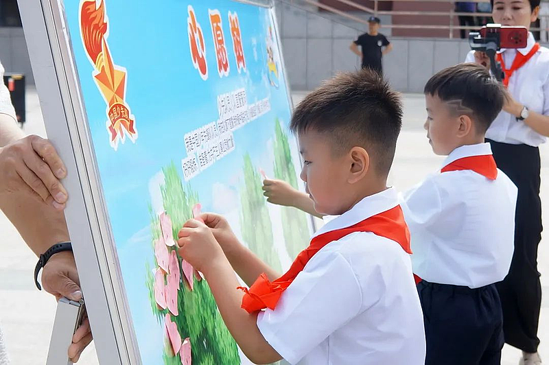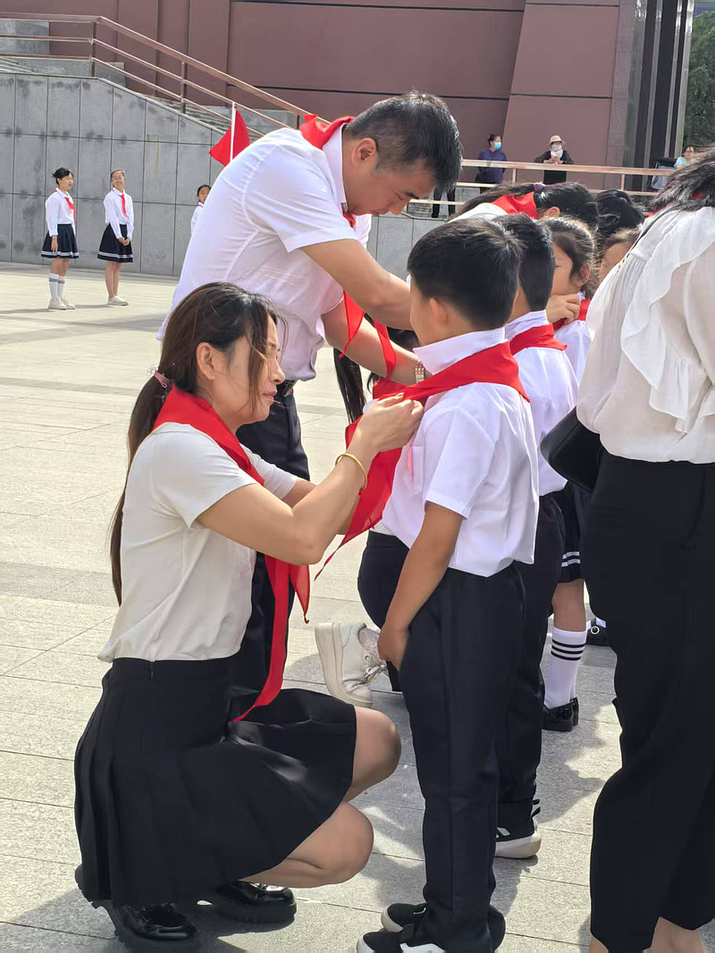 一年级家长代表为新队员佩戴红领巾,这一抹鲜艳的红色不仅是光荣的象征,更承载着责任与使命。