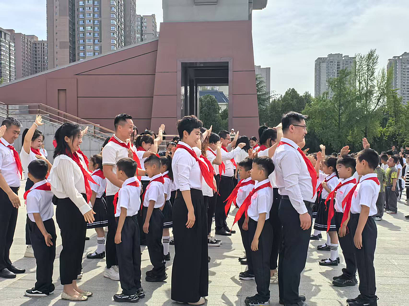 当鲜艳的红领巾飘扬在胸前,新队员与家长代表互敬队礼,这一刻,象征着少先队精神的代代传承。