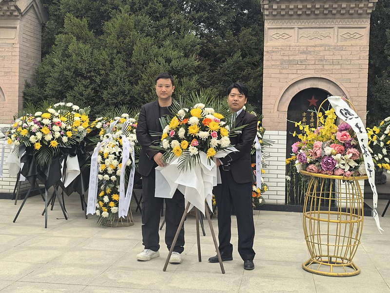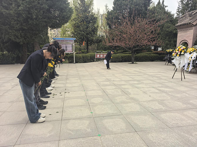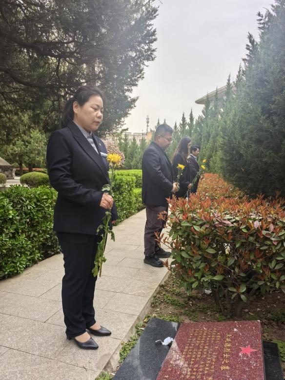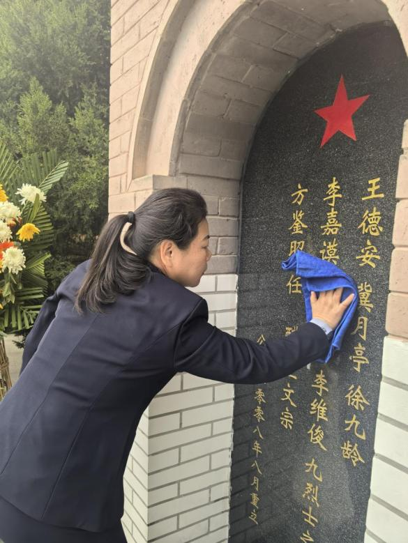 全体人员整齐排列,面向烈士墓碑,饱含着对烈士们的深切缅怀,向烈士们敬献花篮。大家缓缓弯腰,向烈士们深深地鞠躬。随后工作人员拿起抹布,认真细致地擦拭墓碑,清理落叶,并在烈士墓碑前献上鲜花。