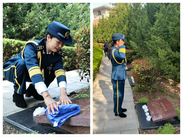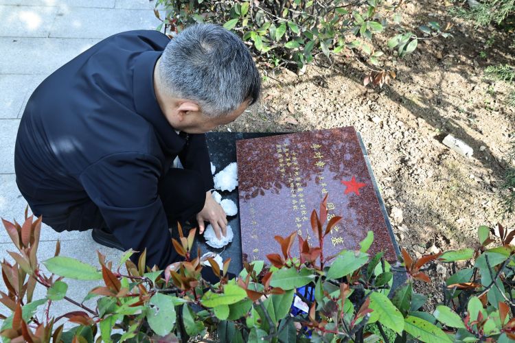 追思会后,大家有序来到烈士墓区,为烈士擦拭墓碑.